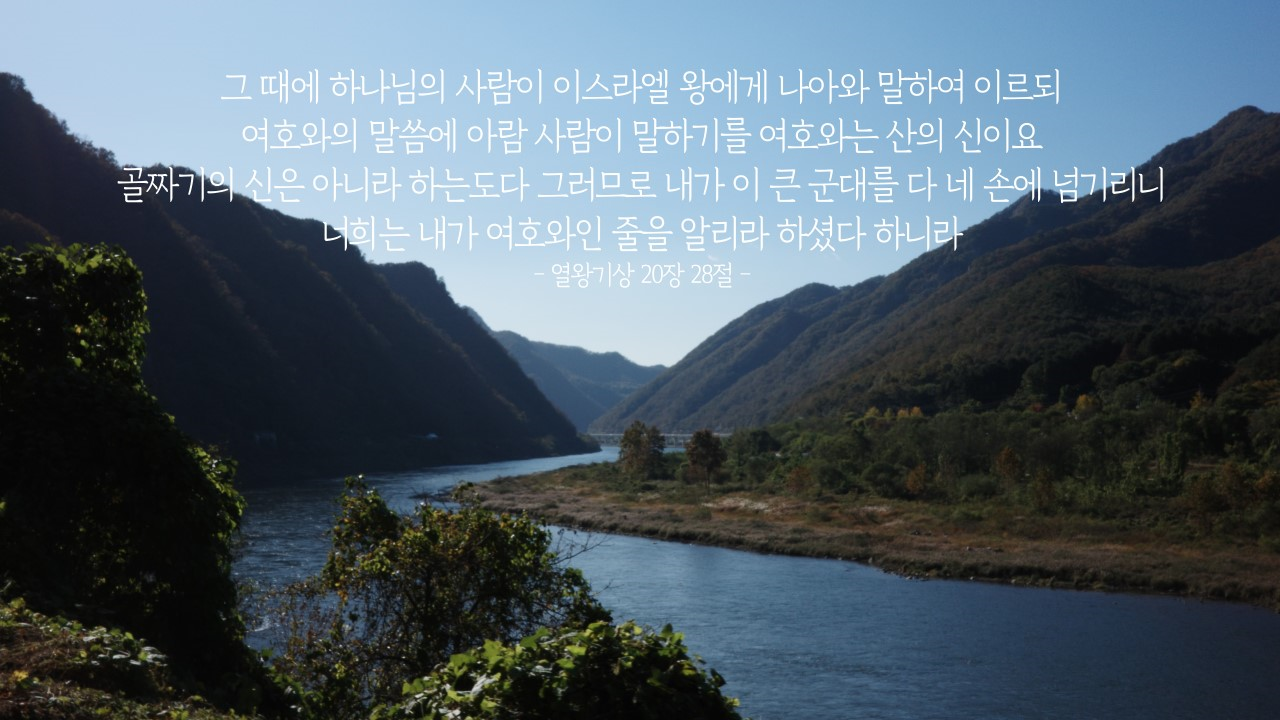 그 때에 하나님의 사람이 이스라엘 왕에게 나아와 말하여 이르되 여호와의 말씀에 아람 사람이 말하기를 여호와는 산의 신이요 골짜기의 신은 아니라 하는도다 그러므로 내가 이 큰 군대를 다 네 손에 넘기리니 너희는 내가 여호와인 줄을 알리라 하셨다 하니라(왕상20:28)